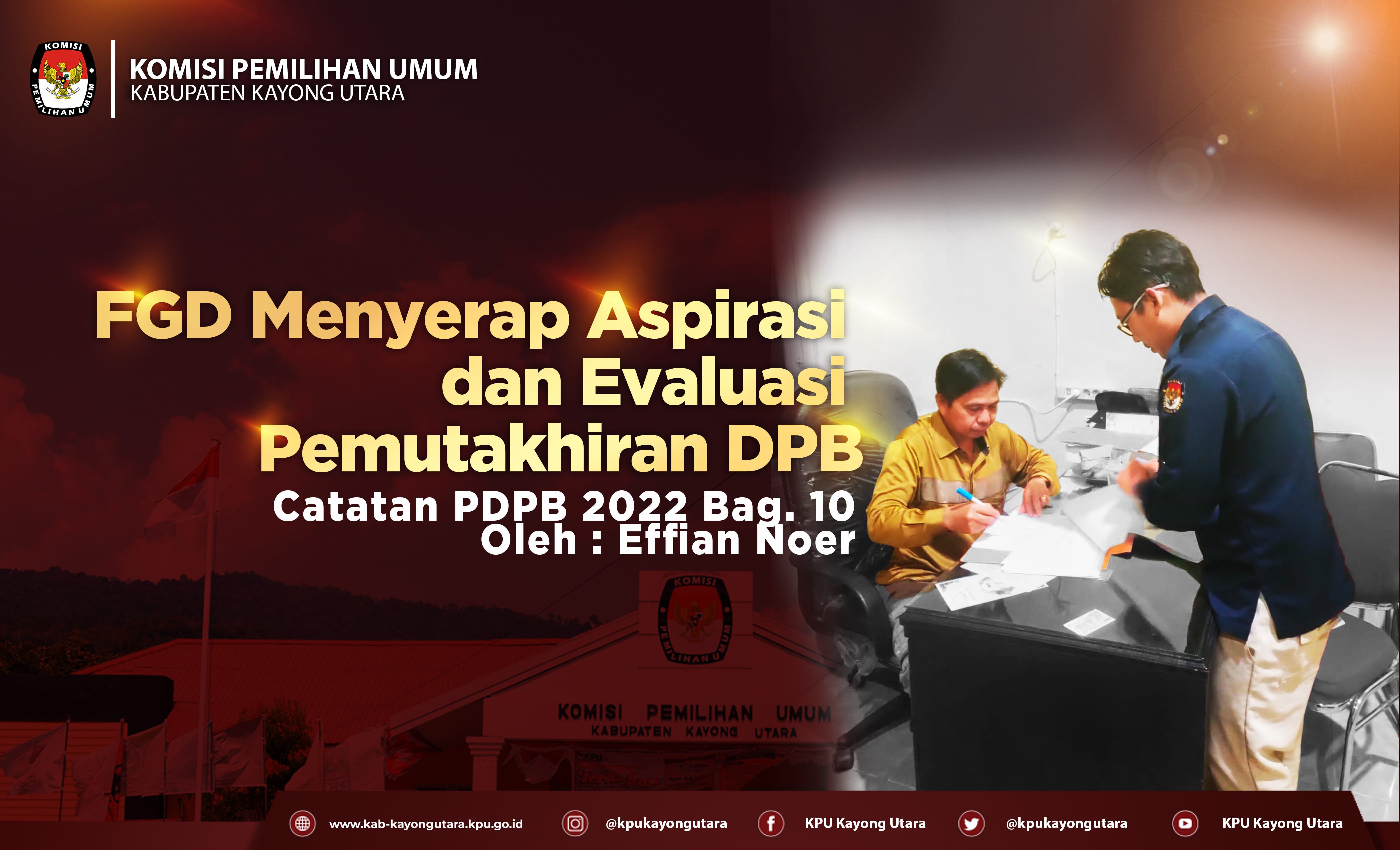 Pemutakhiran data pemilih berkelanjutan merupakan upaya untuk meningkatkan kualitas Daftar Pemilih. KPU Kabupaten Kayong Utara terus berkomitmen untuk menyajikan data pemilih yang konfrehensif, akurat dan mutakhir, Berbagai terobosan telah dilakukan, salah satu ikhtiar menjelang berakhirnya masa Pemutakhiran DPB Tahun 2022, KPU KKU pada bulan September Tahun 2022 diadakan kegiatan Focus Group Discussion (FGD). Kegiatan FGD ini dilakakukan dalam rangka menyerap aspirasi sekaligus mengevaluasi Pemutakhiran DPB selama Tahun 2022. Harapannya berbagai terobosan yang telah dilakukan termasuk berbagai kendala yang dihadapi bisa menjadi catatan bersama, sehingga bisa menjadi masukan dan mencari berbagai solusi terhadap berbagai kendala dalam catatan-catatan tersebut, sehingga diharapkan ke depannya untuk memudahkan pelaksanaan Pemutakhiran Data Pemilih untuk Pemilu dan Pilkada serta dalam Pemutakhiran DPB berikutnya pasca Pemilu dan Pilkada Tahun 2024. KPU KKU mengadakan FGD awal bulan tanggal 1 September Tahun 2022, bertempat di Kafe Diva Jalan Bhayangkara Sukadana. Berbagai stakeholder diundang antara lain: Bawaslu Kabupaten Kayong Utara, DPRD Kabupaten Kayong Utara, Partai Politik Pemilu Tahun 2019, Dinas Kependudukan dan catatan sipil, Dinas Pendidikan, Kantor Kementerian Agama, TNI dan POLRI, Dinas SP3APMD, Dinas Perhubungan, Dinas Kominfo, Kesbangpol, Dinas Kesehatan, Badan Keuangan Daerah Kayong Utara, LPPL Radio Kayong Utara dan Satuan Polisi Pamong Praja. Dari pelaksanaan FGD sangat banyak berbagai masukan, tetapi intinya mereka setiap saat terutama dengan telah adanya Perjanjian Kerjasama antara KPU dengan Pemkab, Dinas, Badan, Kantor di Lingkungan Kabupaten Kayong Utara. Dalam tulisan ini dimuat beberapa masukan diantaranya yaitu 1) Pihak Kemenag sampai saat ini masih tetap berkomitmen bersinergi dengan KPU KKU dalam membantu Pemutakhiran DPB yaitu melalui penyuluh agama yang tersebar di desa kecamatan yang ada di KKU melaporkan penduduk yang meninggal dunia; 2) Diskominfo akan tetap siap berkolaborasi dalam menyebarluaskan melalui perangkat dan media yang ada dalam setiap sosialisasi KPU KKU termasuk dalam pemutakhiran Data Pemilih baik untuk Pemilu dan Pilkada maupun Pemutakhiran DPB pasca Pemilu dan Pilkada tahun 2024; 3) Disdukcapil KKU melalui kasi kependudukan dan Pencatatan Sipil tetap berkomitmen membantu terutama dalam penyandingan data kependudukan dan data DPB KPU KKU. (Penulis Komisioner KPU KKU Divisi Perencanaan, Data dan Informasi)