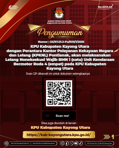 KPU Kabupaten Kayong Utara dengan Perantara Kantor Pelayanan Kekayaan Negara dan Lelang (KPKNL) Pontianak, akan melaksanakan Lelang Noneksekusi Wajib BMN 1 (satu) Unit Kendaraan Bermotor Roda 4 (empat) pada KPU Kabupaten Kayong Utara.