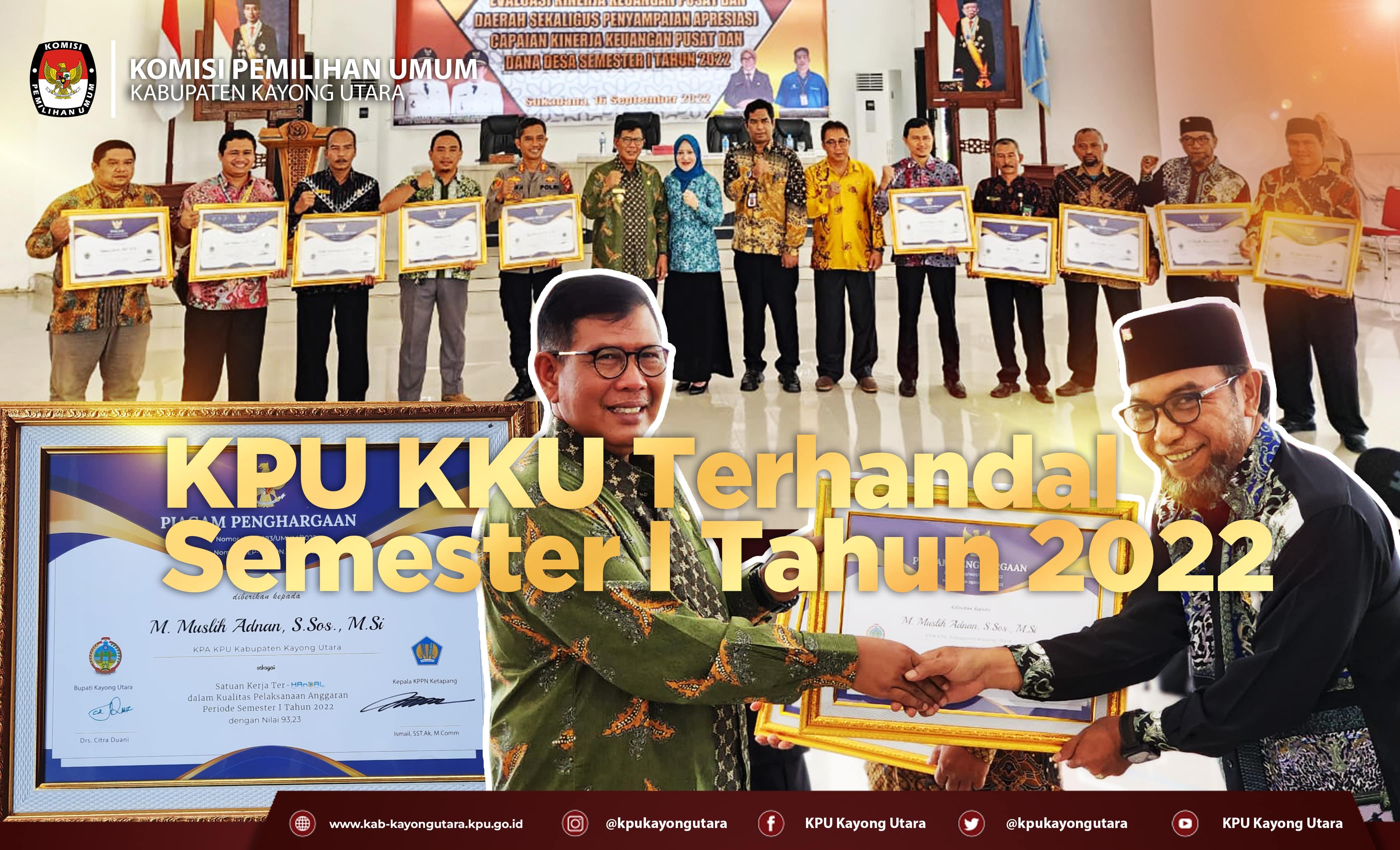 (Sukadana, 16/9/2022), Komisi Pemilihan Umum Kabupaten Kayong Utara (KPU KKU) menerima penghargaan sebagai Satuan Kerja Ter-Handal Dalam Kualitas Pelaksanaan Anggaran Periode Semester I Tahun 2022 oleh Kantor Pelayanan Perbendaharaan Negara (KPPN) Tipe A2 Ketapang dengan nilai 93,23. Piagam Penghargaan diberikan langsung oleh Bupati Kayong Utara, Citra Duani sebagai mitra kerja KPPN Ketapang kepada M.Muslih Adnan selaku Kuasa Pengguna Anggaran (KPA), yang diwakili oleh Komisioner Divisi Hukum dan Pengawasan, M. Rusdiansyah. Penghargaan dari KPPN Ketapang kepada KPU KKU diberikan sebagai apresiasi atas kinerja pelaksanaan APBN dalam mendukung percepatan pemulihan ekonomi di Kabupaten Kayong Utara. Acara yang dihelat di Aula Istana Rakyat (Pendopo Bupati) KKU turut menghadirkan Satuan Kerja Instansi Vertikal dan Pemerintah Desa di wilayah KKU. Acara di awali sambutan Kepala Dinas SP3APMD Kabupaten Kayong Utara, Nendar Soeheri. “ Tujuan penghargaan ini selain untuk mengapresiasi atas kinerja perangkat desa dalam pemulihan ekonomi di Kabupaten Kayong Utara, juga untuk meningkatkan motivasi para kepala desa dalam pencapaian kinerja pelaksanaan APBN sesuai peraturan berlaku”, ujar Nendar dalam sambutannya. Dalam kesempatan berikutnya, Ismail selaku Kepala KPPN Ketapang melaporkan pencapaian hasil pelaksanaan APBN dan penyaluran dana desa periode Semester I Tahun 2022. Dalam laporannya Ismail memaparkan, “ Dibanding Tahun 2021, pelaksanaan APBN dan penyaluran dana desa Tahun 2022 sudah mengalami kemajuan. Selain dukungan bupati dan para kepala desa, mekanisme penyaluran dari kecamatan ke tingkat desa sangat menentukan dalam peningkatan program UMKM”. Kemudian acara dilanjutkan dengan sambutan Bupati Kayong Utara dan sekaligus membuka acara. Dalam sambutannya Citra Duani mengatakan, “ Penyaluran Dana Alokasi Khusus (DAK) dan Dana Alokasi Umum (DAU) baik fisik dan nonfisik untuk Tahun 2022 sudah mencapai angka 96,51 %. Ini memberi harapan kepada masyarakat karena dana tersebut ada dan beredar di masyarakat, dan dapat dirasa langsung manfaatnya oleh masyarakat”. Lebih lanjut Citra mengapresiasi kepada para kades dan penjabat kades yang mendapatkan penghargaan. “ Ini merupakan sebuah karya karena melaksanakan tugas dengan baik. Dan bagi yang belum mendapat, agar kedepannya memperbaiki mekanisme dan kinerjanya”. Ujar Citra mengakhiri sambutannya. Untuk para undangan dan penerima penghargaan, khususnya Satuan Kerja Instansi Vertikal, acara di akhiri dengan Pengumuman dan Penyerahan Piagam Penghargaan Bupati dan Kepala KPPN kepada Pimpinan Instansi Vertikal.(kul)