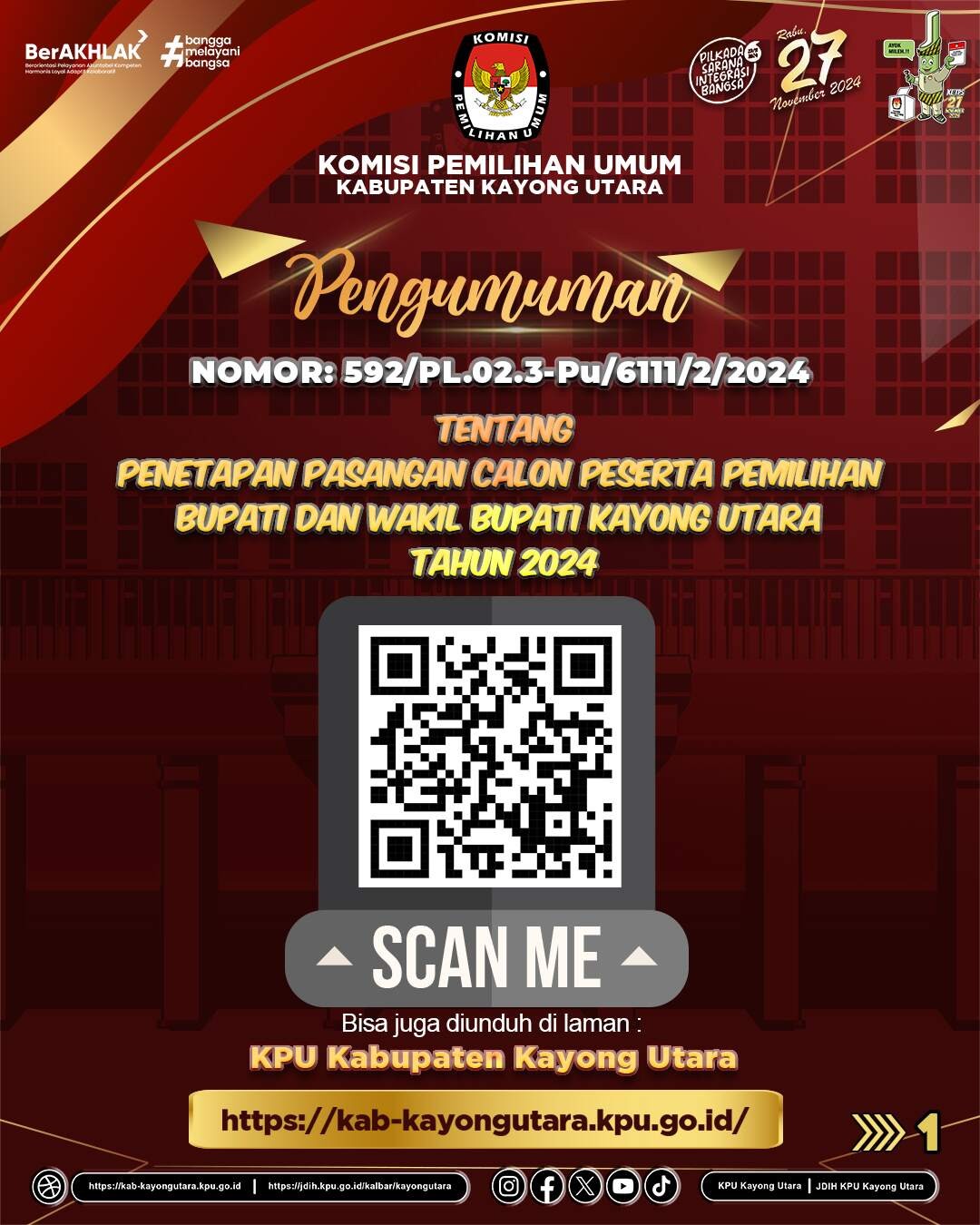 Pengumuman Nomor : 592/PL.02.3-Pu/6111/2/2024 selengkapnya dapat diunduh melalui laman resmi KPU Kabupaten Kayong Utara
