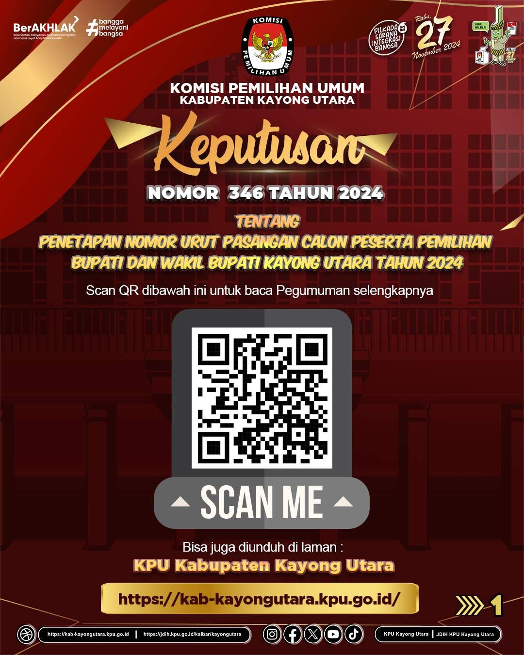 Nomor 346 Tahun 2024 Tentang Penetapan Nomor Urut Pasangan Calon Peserta Pemilihan Bupati Dan Wakil Bupati Kayong Utara Tahun 2024.