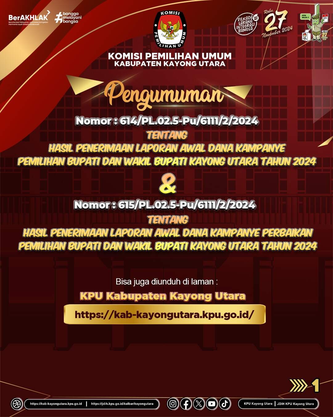 #TemanPemilih , KPU Kabupaten Kayong Utara menyampaikan Pengumuman Hasil Penerimaan Laporan Awal Dana Kampanye dan Hasil Penerimaan Laporan Awal Dana Kampanye Perbaikan Pemilihan Bupati dan Wakil Bupati Kayong Utara Tahun 2024