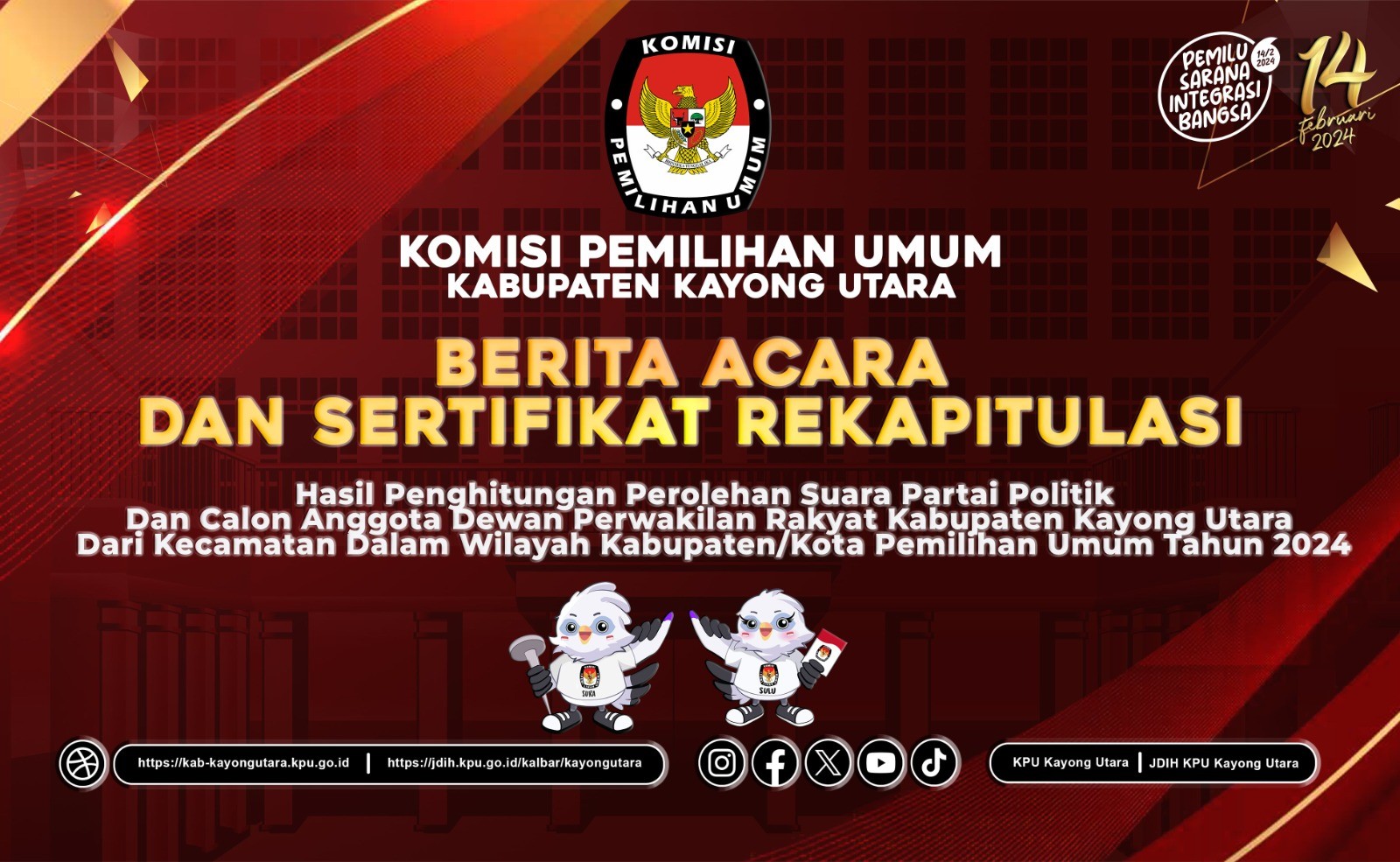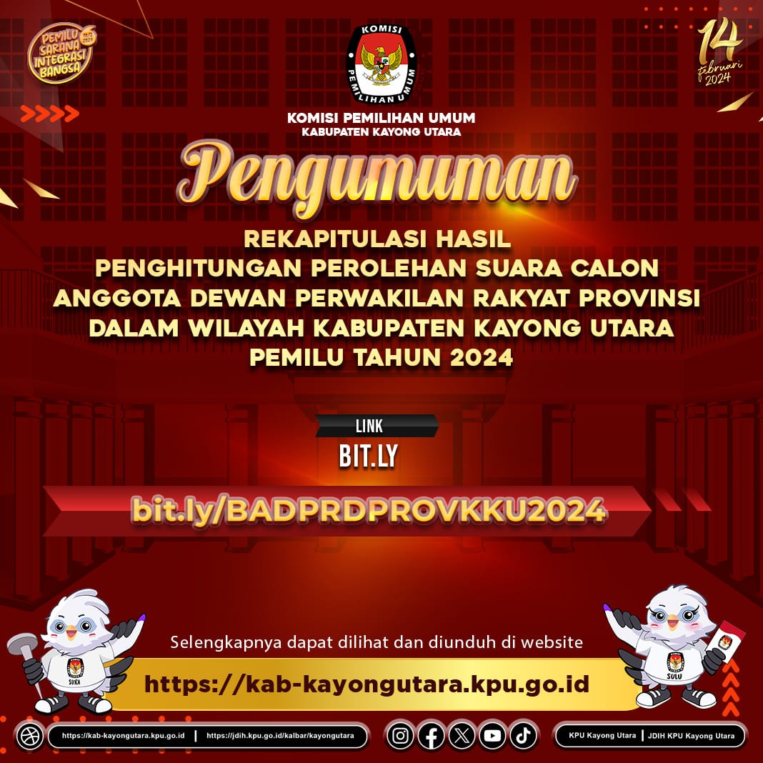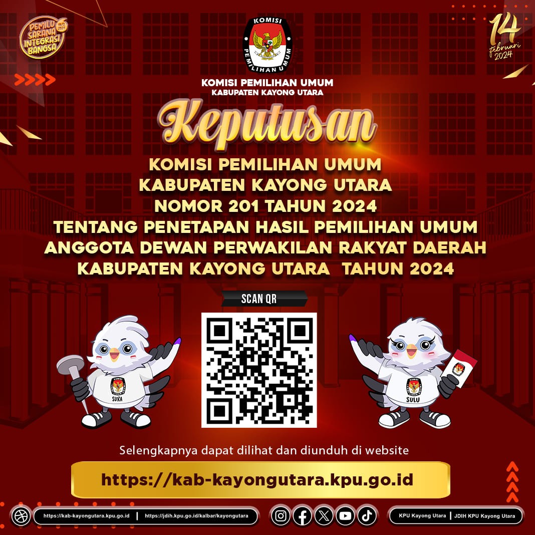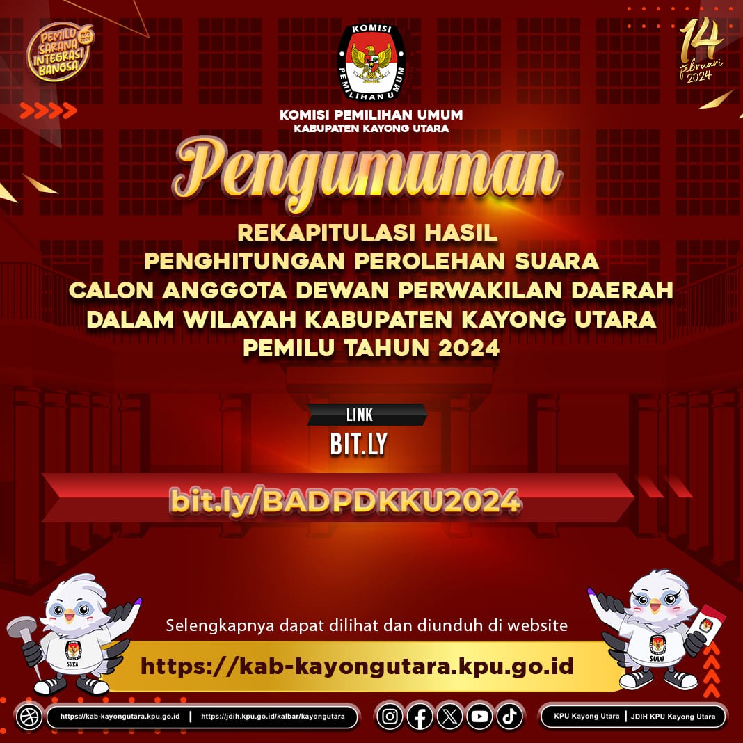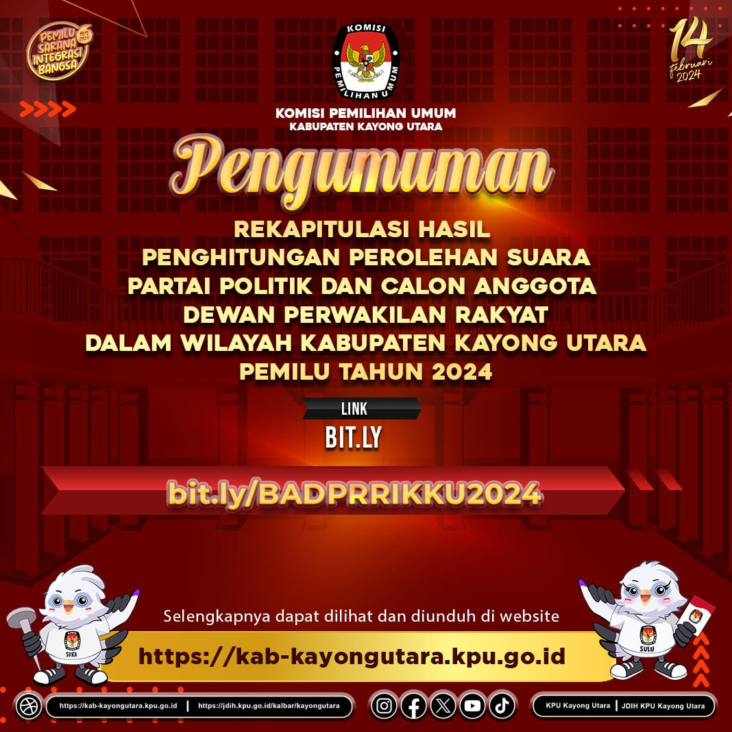 Hai #TemanPemilih, KPU Kabupaten Kayong Utara mengumumkan rekapitulasi hasil penghitungan perolehan suara partai politik dan calon Anggota Dewan Perwakilan Rakyat Kabupaten dalam Pemilihan Umum Tahun 2024.